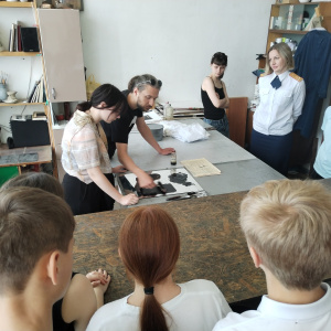 Следственным комитетом была организована для детей интереснейшая экскурсия в выставочный зал Союза художников Ставрополья. Также детям был проведен мастер класс по станковой печати. Дети украсили футболки изображением русской матрешки.